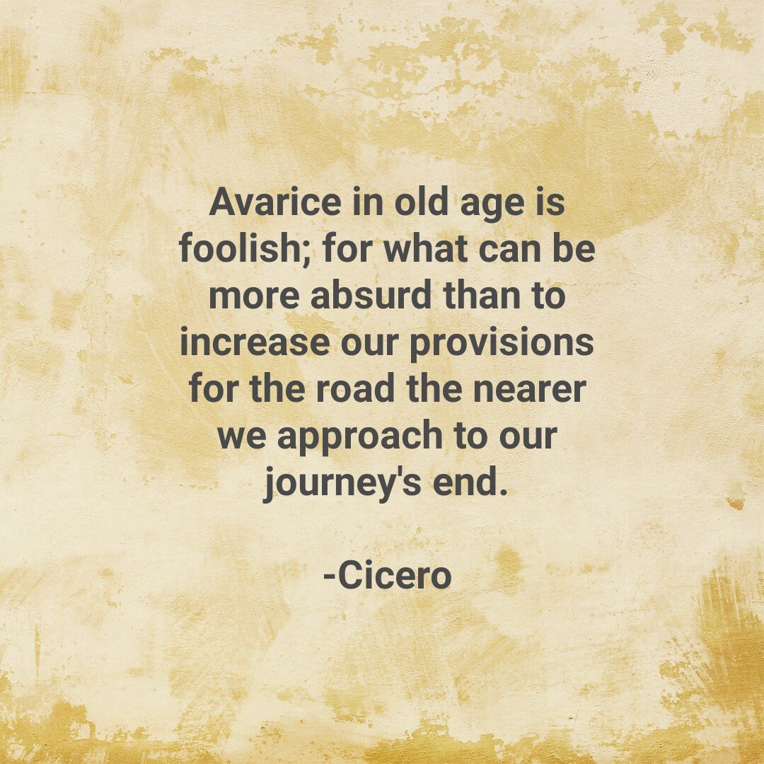 “Avarice in old age is foolish; for what can be more absurd than to increase our provisions for the road the nearer we approach to our journey’s end.”