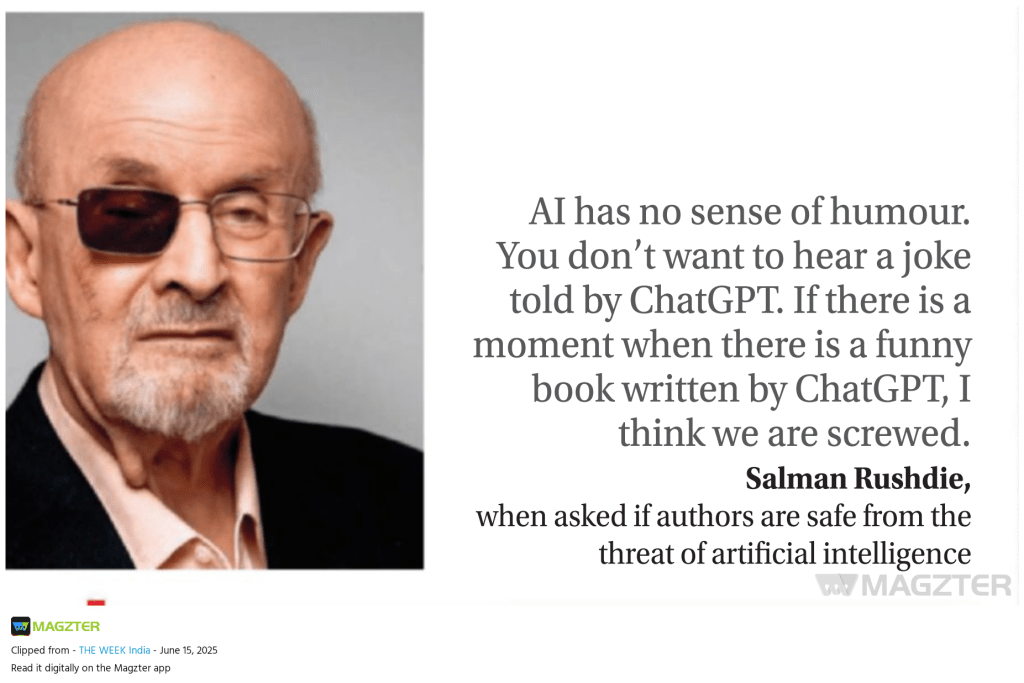 “AI has no sense of humor. You don’t want to hear a joke told by ChatGPT. If there is a moment when there is a funny book written by ChatGPT, I think we are screwed.”