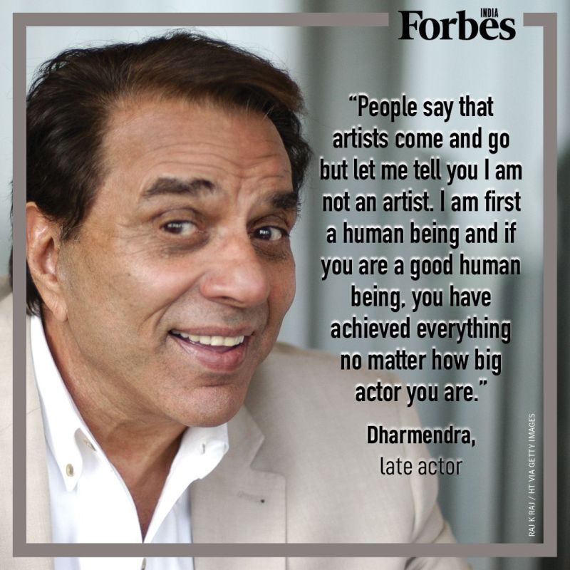 “People say that artists come and go but let me tell you I am not an artist. I am first a human being and if you are a good human being, you have achieved everything no matter how big actor you are.” —Dharmendra.